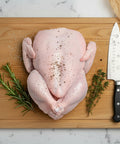 Preheat oven to 200°C. Season the chicken with salt, pepper, garlic, herbs, and olive oil. Place on a roasting tray and cook for approximately 60–90 minutes depending on weight. Baste occasionally to maintain moisture. Allow to rest for 10–15 minutes before carving.